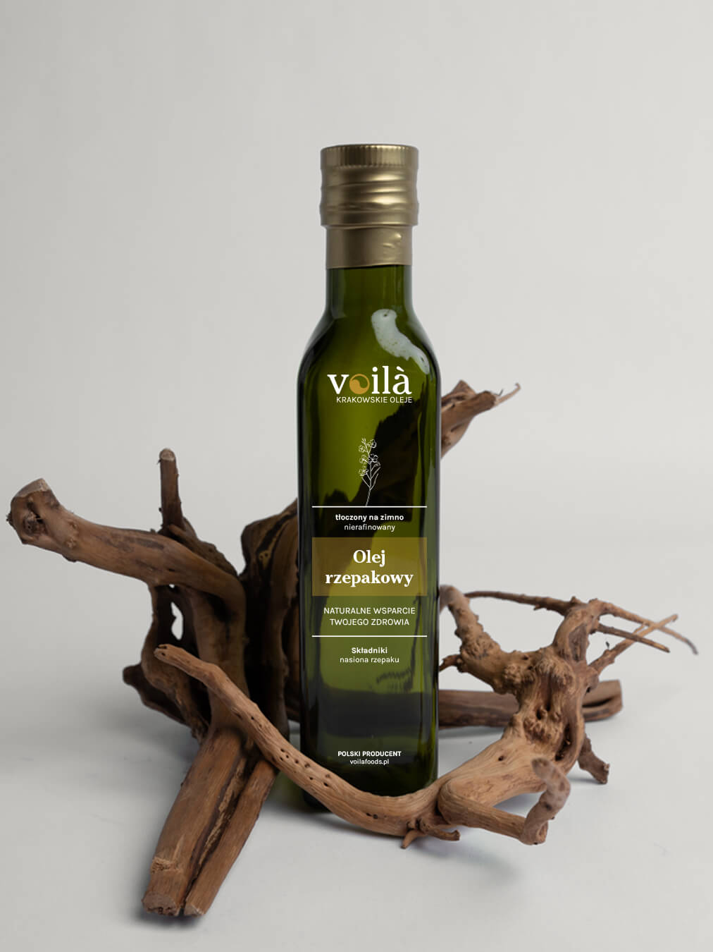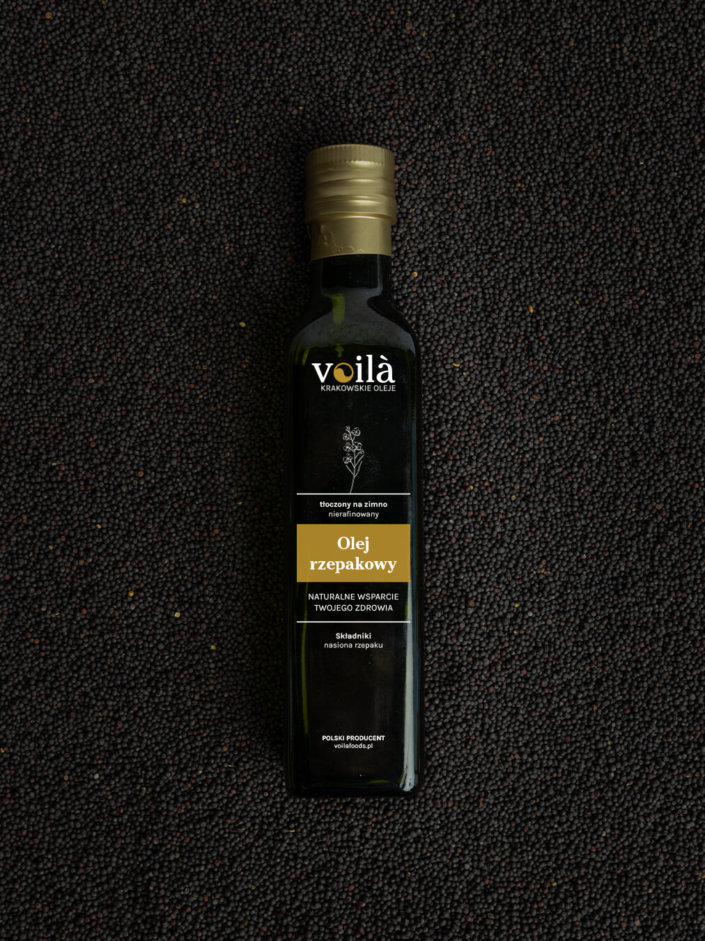 Olej Voila tłoczony jest na zimno w prasie ślimakowej. Jest to proces mechanicznego wyciskania oleju z nasion, który odbywa się bez użycia wysokiej temperatury. Dzięki temu uzyskany olej zachowuje swoje naturalne właściwości, bogactwo składników odżywczych oraz charakterystyczny smak i aromat.