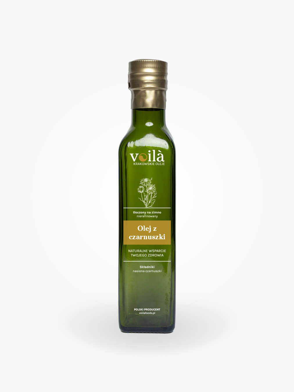 Olej z czarnuszki Voila to naturalny produkt pozyskiwany w naszej małej manufakturze z nasion czarnuszki siewnej . Charakteryzuje się intensywnym, korzennym smakiem i aromatem. Jest bogaty w nienasycone kwasy tłuszczowe, witaminy, minerały, a także związki bioaktywne, takie jak tymochinon, który wykazuje właściwości przeciwzapalne, antyoksydacyjne i wspierające układ odpornościowy. Olej z czarnuszki Voila znajduje zastosowanie zarówno w kuchni, jak i w kosmetyce, gdzie pomaga nawilżać skórę, łagodzić podrażnienia i wzmacniać włosy. Regularne spożywanie może wspierać zdrowie układu trawiennego i oddechowego.